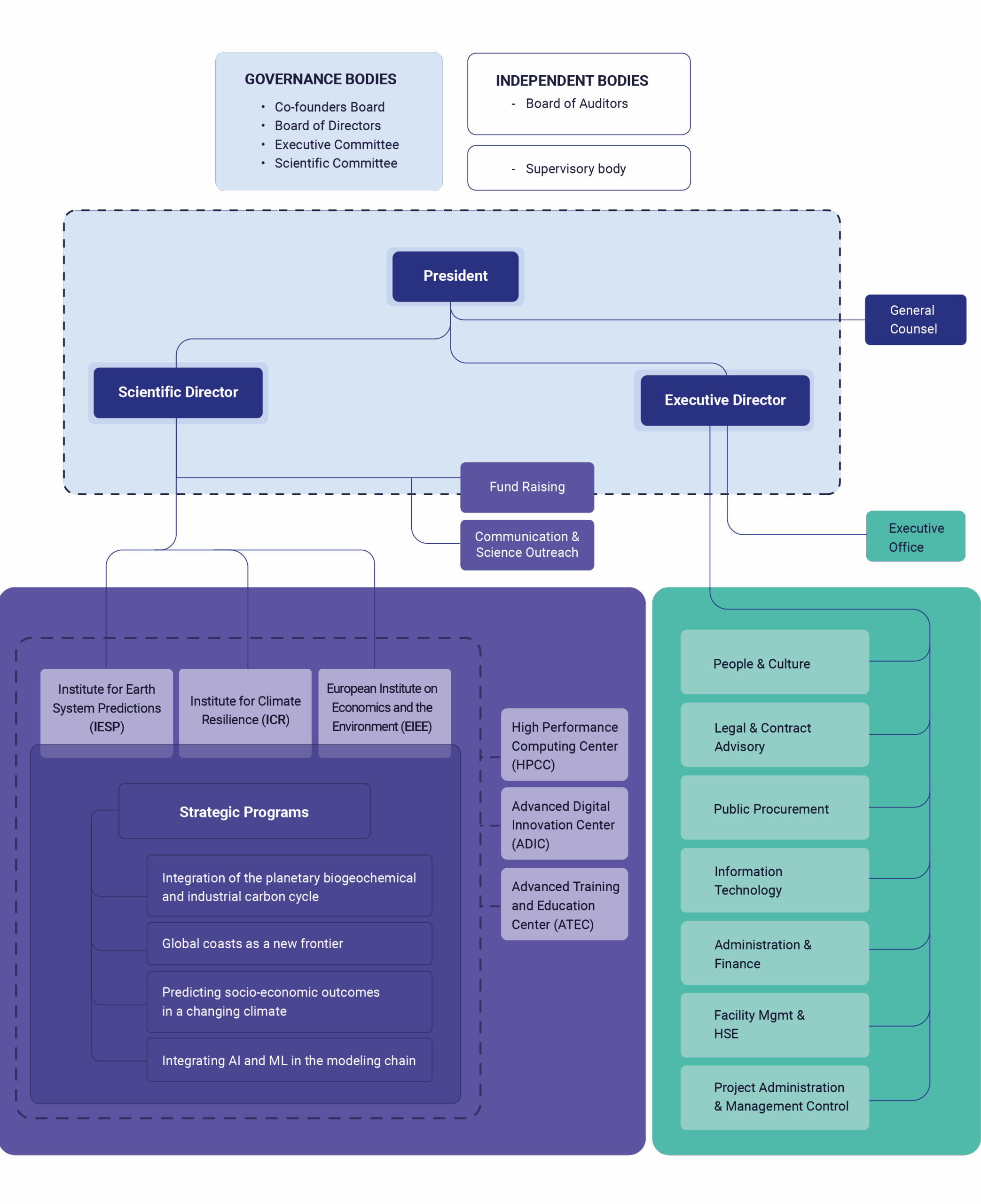 It deals with day to day secretarial operations of the Foundation, manages relationships with external stakeholders and, through the Organization, Processes, and Change area, ensures that the organizational structure and operational processes are aligned with the strategic ambitions and priorities of the Executive Leadership.