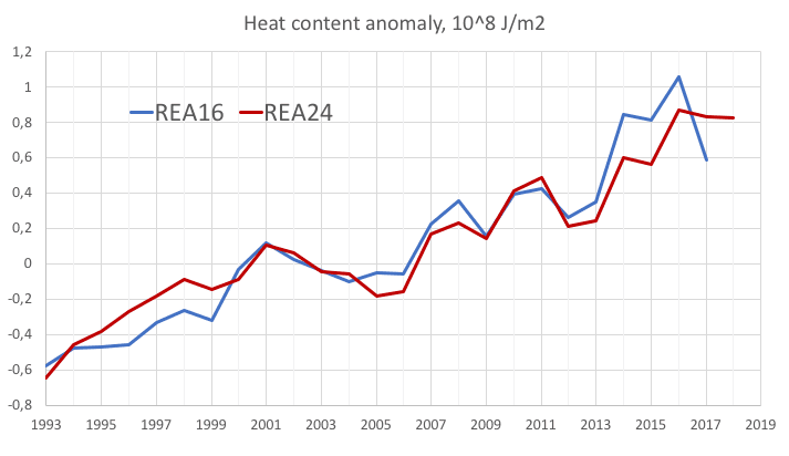 - Figure 4: Mediterranean Sea Heat Content in the upper 700m evaluated from the new Reanalysis (REA24) and the previous one (REA16). Both reanalysis confirm an increase of the heat content showing a similar trend.
