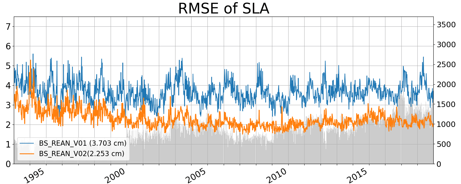 - Figure 8: Skill of the new Black Sea reanalysis (BS_REAN_V02) compared to the previous one (BS_REAN_V01) in terms of Sea Level Anomaly Root Mean Square Error with respect to altimetric satellite observations for the period from 1993 to 2018.