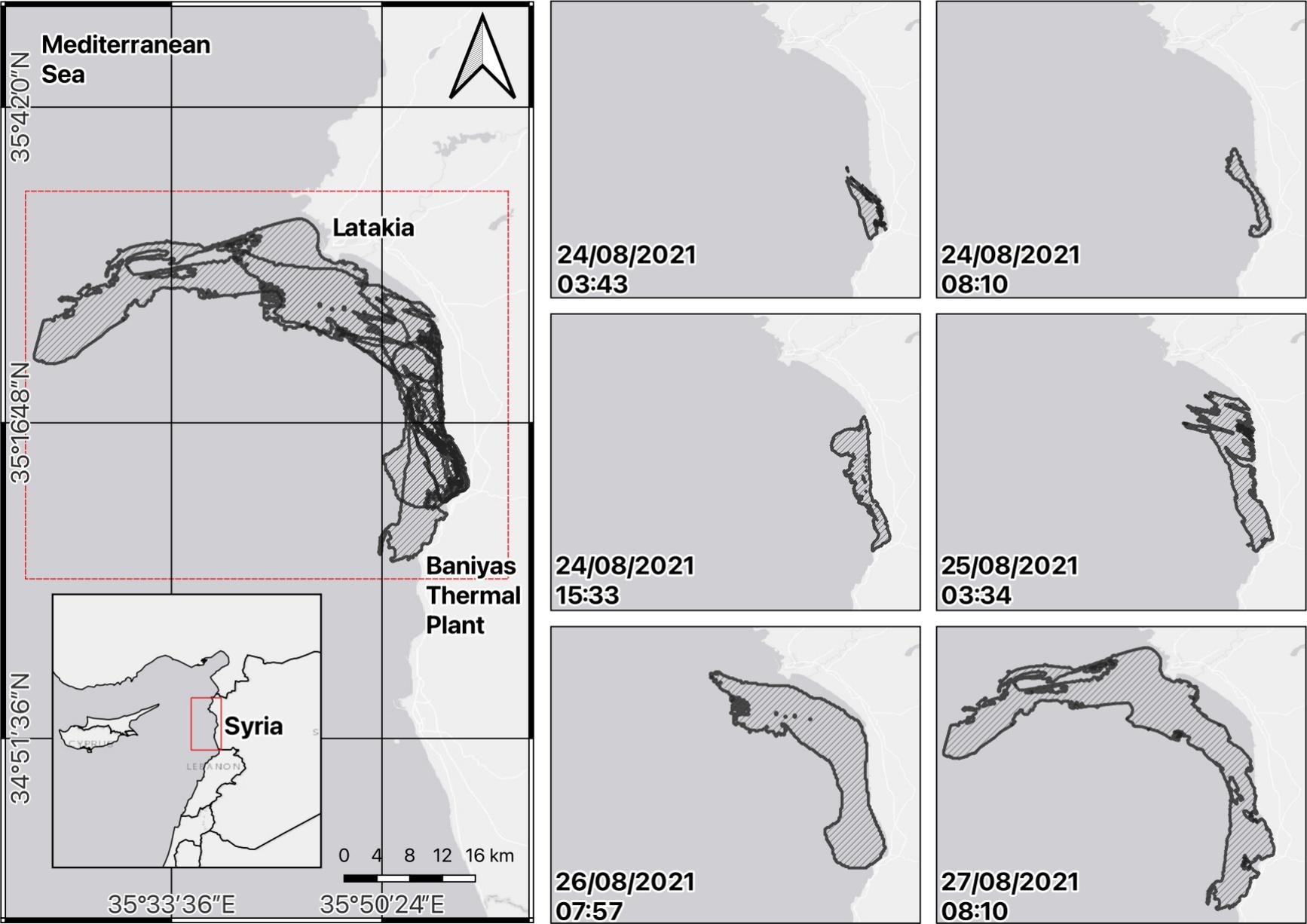 Macchie di petrolio selezionate dal 24 al 27 agosto 2021 relative all’incidente della fuoriuscita di petrolio a Baniyas, in Siria. Ogni pannello mostra le fasi consecutive della chiazza di petrolio secondo le rilevazioni satellitari e i tempi di rivisitazione. Fonte: Accarino et al, 2025