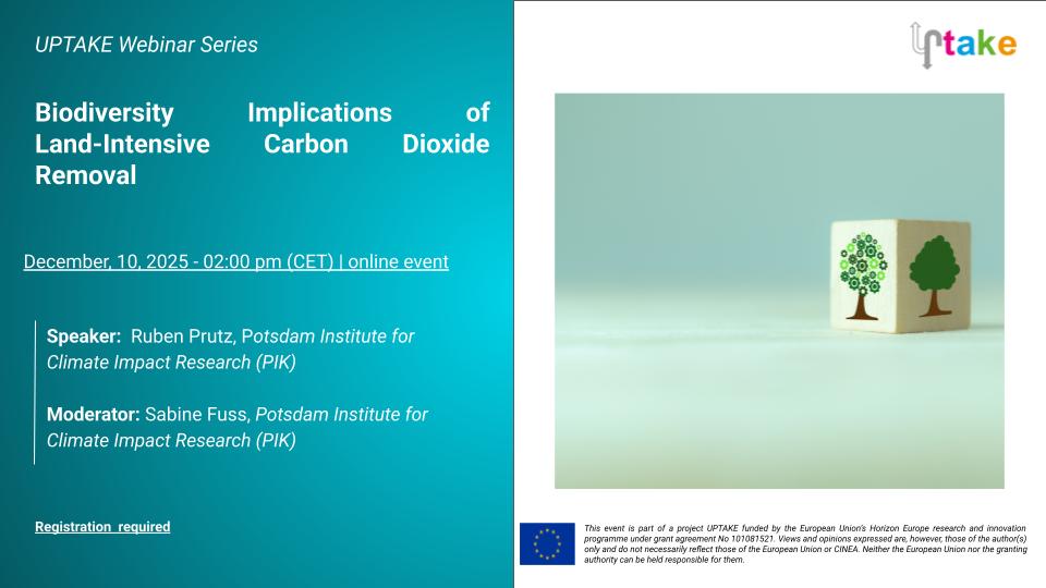 The UPTAKE monthly webinar series returns, continuing its engaging discussions on carbon dioxide removal (CDR) technologies and the latest research developments. The next session in the series, dedicated to recent publications on CDR research, will focus on the paper Biodiversity Implications of Land-Intensive Carbon Dioxide Removal.
