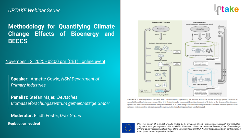 The UPTAKE monthly webinar series returns, continuing its engaging discussions on carbon dioxide removal (CDR) technologies and the latest research developments. The next session in the series, dedicated to recent publications on CDR research, will focus on the paper “Quantifying climate change effects of bioenergy and BECCS: critical considerations and guidance on methodology.”
