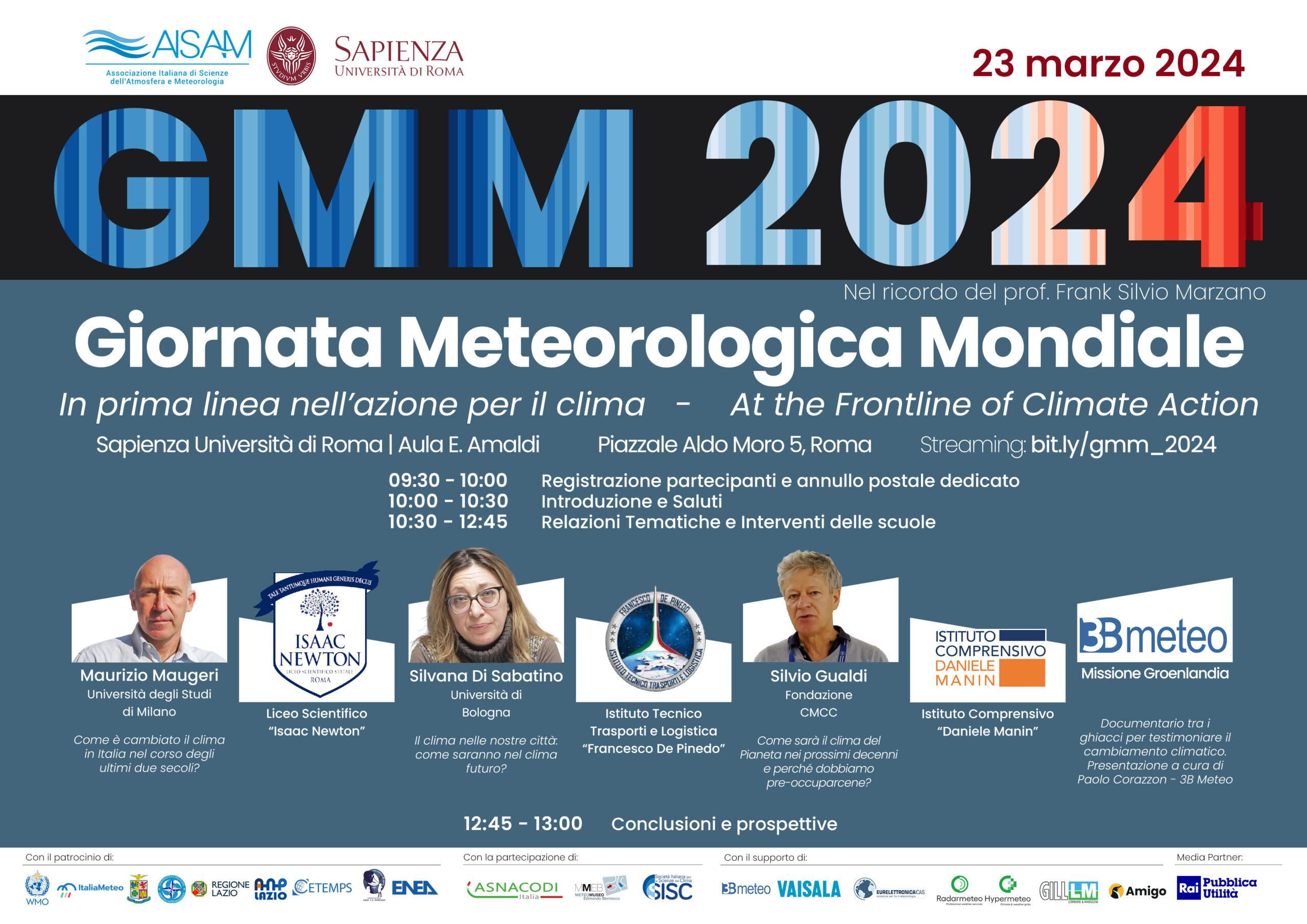 L’edizione 2024 si terrà nell’Aula “E. Amaldi”, presso l’edificio G.Marconi (CU013) Dipartimento di Fisica nel Campus di Sapienza Università di Roma, ancora una volta in modalità “ibrida” (sia in presenza che on-line, su piattaforma informatica, al link bit.ly/gmm_2024 ), e sarà dedicato al ricordo del compianto Prof. Frank Silvio Marzano, promotore delle precedenti edizioni e prematuramente scomparso.