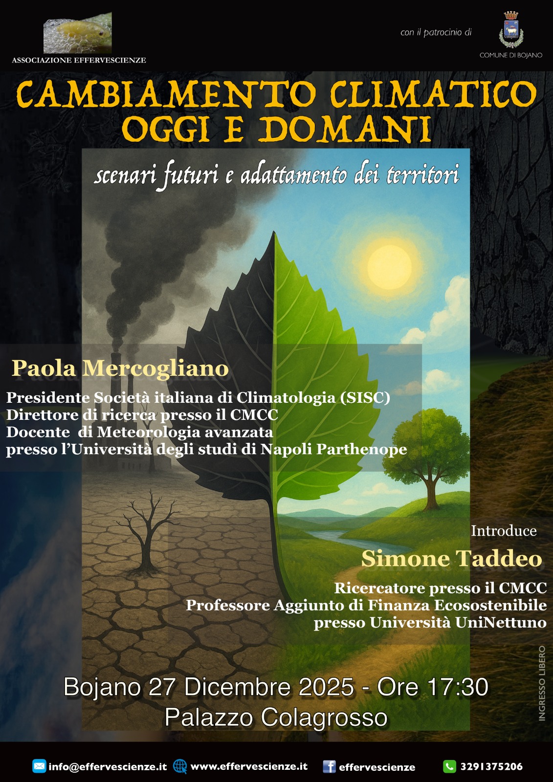 Il CMCC partecipa all’evento “Cambiamento climatico oggi e domani. Scenari futuri e adattamento dei territori”, in programma il 27 dicembre 2025, con Paola Mercogliano e Simone Taddeo, ricercatori del Centro, che prenderanno parte all’iniziativa contribuendo alle attività di confronto e approfondimento sui temi oggetto dell’incontro.
