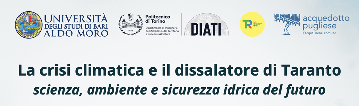 Mercoledì 26 novembre 2025, si terrà a Taranto il seminario “La crisi climatica e il dissalatore di Taranto. Scienza, ambiente e sicurezza idrica del futuro”, promosso dall’Università degli Studi di Bari Aldo Moro, in collaborazione con il Politecnico di Torino – DIATI, Rete Professioni Tecniche Ionica e Acquedotto Pugliese. L’incontro si svolgerà nell’Aula Magna della Facoltà di Scienze Naturali (Via Alcide De Gasperi).