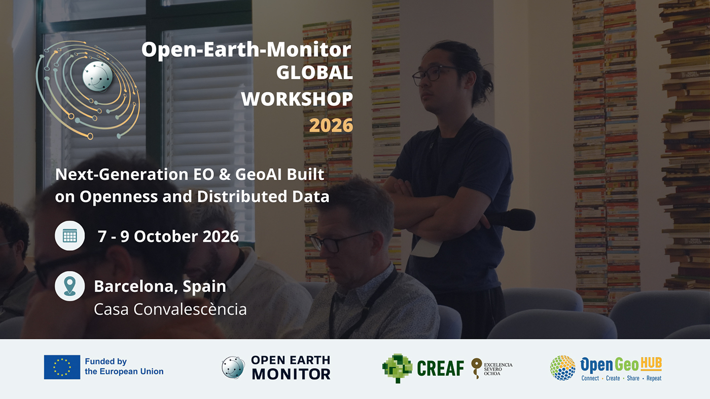 The final Open-Earth-Monitor Cyberinfrastructure (OEMC) Global Workshop 2026: “Next-Generation EO & GeoAI Built on Openness and Distributed Data”, will be held in Barcelona, Spain, from 7–9 October 2026 (hosted by CREAF and the OpenGeoHub Foundation).